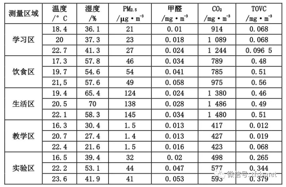 表1 为对校园不同区域(包括食堂、图书馆、学生公寓、教学楼、实验室)室内甲醛浓度及其他指标的测定结果。
