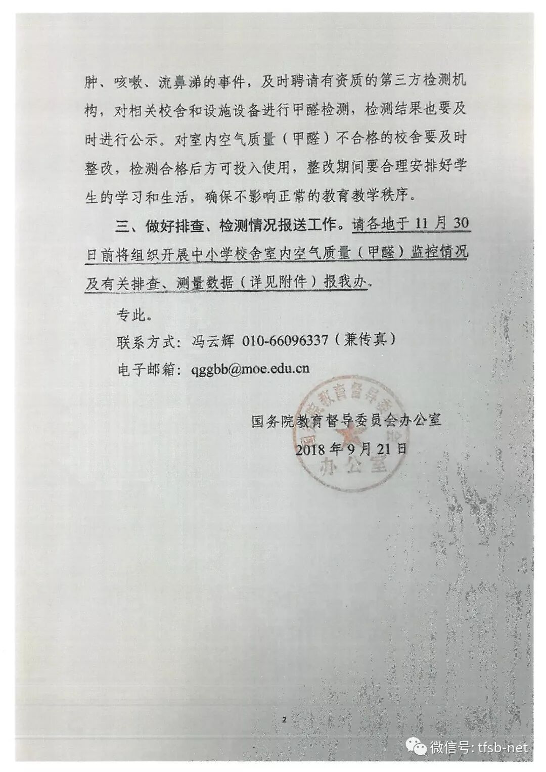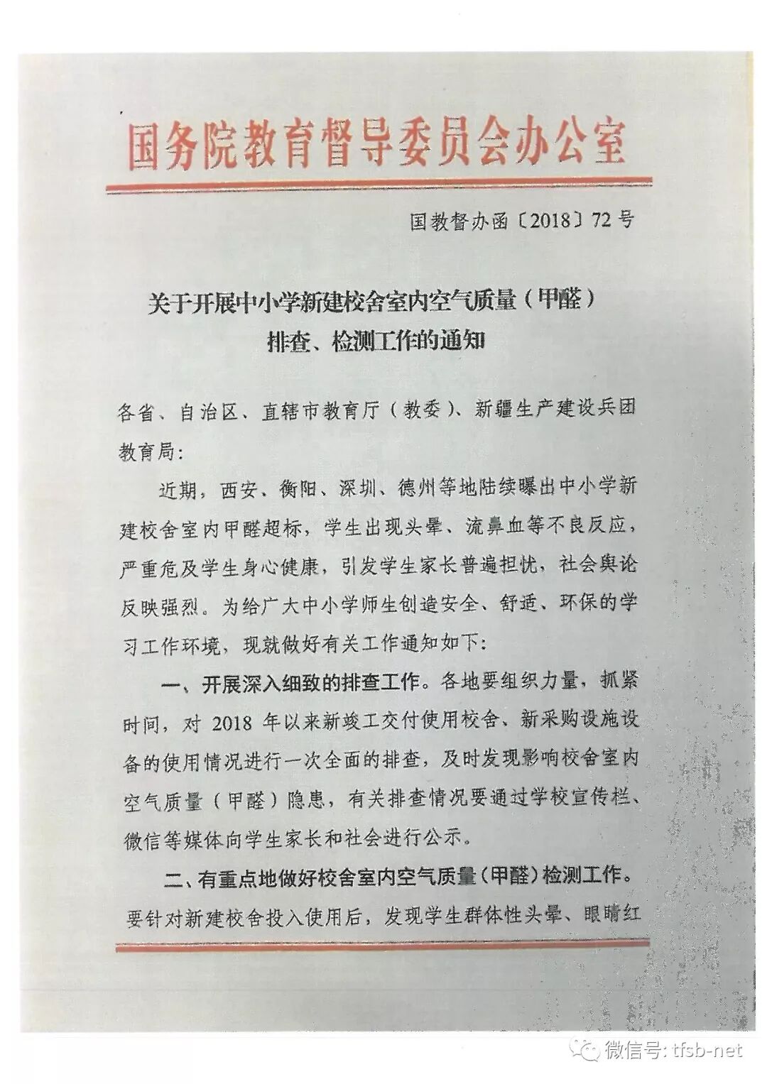 各地要对新建校舍进行全面排查,对于可能存在室内空气质量安全隐患的校舍,要聘请有资质的第三方检测机构进行检测;对于发现有学生群体性头晕、眼睛红肿、咳嗽、流鼻涕等异常情况的学校和区域,要第一时间向有关部门报告,并及时疏散学生,开展空气质量检测。各地排查、检测工作原则上在11月中旬完成(以检测机构出具检测报告的时间为准。