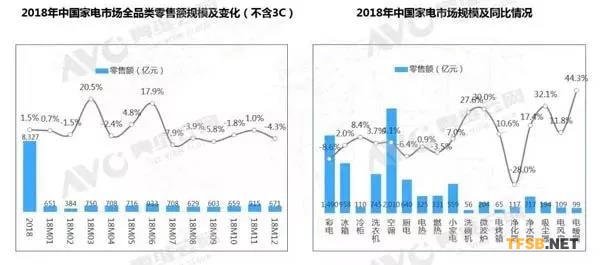 2018年中国家电市场整体面临的较大压力,零售额规模累计8327亿元(包含25个常见品类),同比增长1.5%,可这个增速是去年增速的七分之一,中国家电市场面临着整体失速危机。彩电、冰洗、空调等传统品类均出增速下滑,受房地产低迷影响较为严重的厨电、热水器品类,市场规模也集体下滑。生活电器稳健增长,体现品质和改善类需求的小家电产品持续增长。洗碗机、吸尘器等健康电器仍然快速增长,但是增速较去年有所放缓。