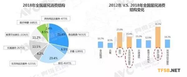 2018年全国人均可支配收入28228元,同比增长6.5%。全国居民人均消费支出19853元,同比增长6.2%。其中居住消费、生活用品及服务消费、医疗保健的消费支出同比涨幅显著,其他类型消费占比均下降。高附加值领域支出的趋增体现中国老百姓对高品质生活的追求以及健康意识的提升。80后与90后成为的消费观念从过去的生存消费、品牌消费转变为品质消费,消费渠道也更加的随机与多样。传统的线上或线下购买以无法满足现代消费者的需求,注重体验,追求多维度的消费方式成为当下主流。