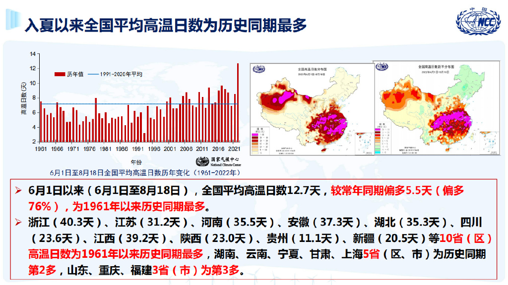 虽已立秋,但“三伏天”的“末伏”阶段,国内多地仍处于高温炙烤之下。根据国家气候中心监测数据,6月1日以来(6月1日至8月18日),全国平均高温日数12.7天,较常年同期偏多5.5天,为1961年以来历史同期最多。“全国有1832站(占所有国家级气象站的73.2%)日最高气温达到或超过35℃,其中,有1297站(占51.8%)日最高气温达到或超过38℃;665站(占26.6%)日最高气温达到或超过40℃,135站(占5.4%)日最高气温达到或超过42℃”,国家气候中心正研级高工、中国气象局气象服务首席专家叶殿秀对今年三伏天以来的国内高温天气进行总结,“35℃以上高温覆盖面积有536万平方公里;中东部地区有23个省(市)出现40℃以上高温,覆盖面积达136.5万平方公里,影响人口约2.9亿。”