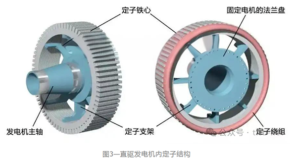 定子铁心安装在定子支架上,定子支架一端有安装到机舱机座的法兰,另一端是外转子转轴,也是风力发电机的主轴,主轴要负担整个风轮与外转子的重量与风力,主轴与法兰盘要有很高的强度。