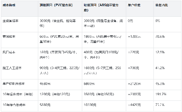 从表格数据可清晰看出,单户初期总成本中,顶送顶回(PVC管方案)为4680元,地送顶回(ABS扁平管方案)为6800元,单户成本相差2120元,若采用PE管替代PVC管提升品质(管线成本增加300元),顶送顶回单户初期总成本为4980元,仍比地送顶回低1820元,降幅达26.8%。