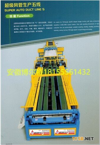全自动风管生产五线,直线型结构,减少板料传送时间,生产效率高,板料均采用独立的变频调速电机驱动,10棍校平压筋机构,保证各种厚板板材的平整度,采用加工省料模式,每卷料只有一块小于20mm的废料,折方伺服送料,定位精确,尤其是在口字型风管加工时,优势明显,采用触摸屏和键盘双模式,保证操作的稳定性,仅需一人操作,二人取走管道,带加工计数功能,便于统计和管理,具有日累计数,累计计数,支持打印机功能,进行生产管理。另可选择7mm法兰边的双机联动设备用于生产角钢法兰生产风管。